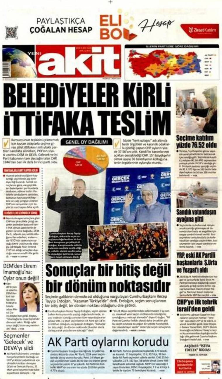 Yandaş Akit ise seçim sonuçlarını hazmedemedi. Yandaşlar "Belediyeler kirli ittifaka teslim" manşetiyle çıktı.
