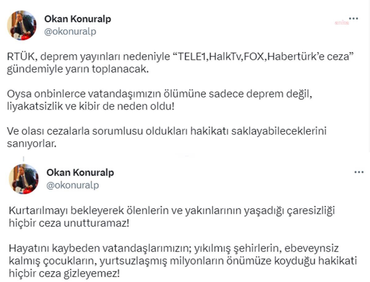 Radyo ve Televizyon Üst Kurulu (RTÜK) üyesi Okan Konuralp, RTÜK’ün Kahramanmaraşlı merkezli depremlerin ardından yaptıkları yayınlar nedeniyle TELE 1, Halk TV, Fox TV ve Habertürk’e ceza verilmesi gündemiyle toplanacağını duyurdu.