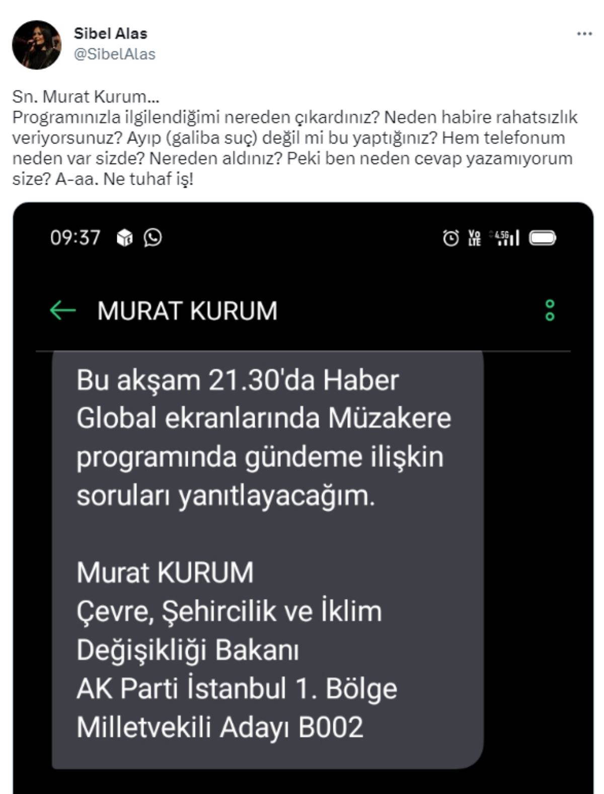 Müzisyen Sibel Alaş, yaptığı paylaşımda "Sn. Murat Kurum... Programınızla ilgilendiğimi nereden çıkardınız? Neden habire rahatsızlık veriyorsunuz? Ayıp (galiba suç) değil mi bu yaptığınız? Hem telefonum neden var sizde? Nereden aldınız? Peki ben neden cevap yazamıyorum size? A-aa. Ne tuhaf iş!" dedi.