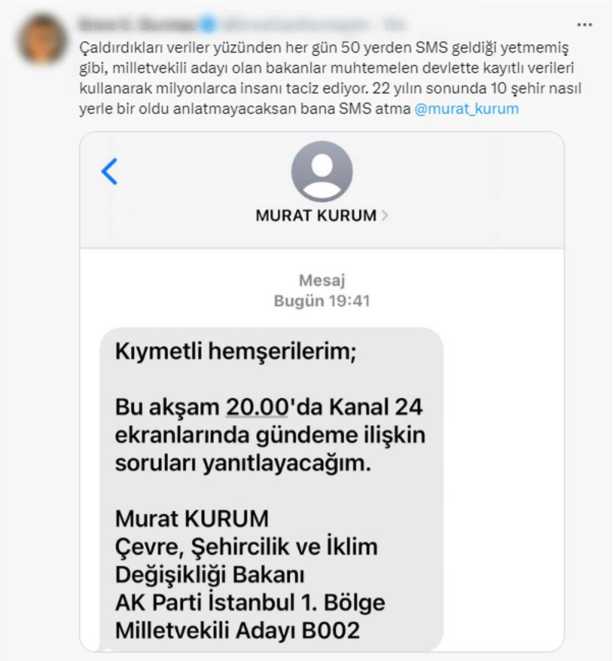 Türkiye'nin beklediği seçime 12 gün kala Çevre, Şehircilik ve İklim Değişikliği Bakanı Murat Kurum'un katılacağı televizyon programlarına ilişkin yurttaşlara attığı SMS'ler sosyal medyada gündem oldu.