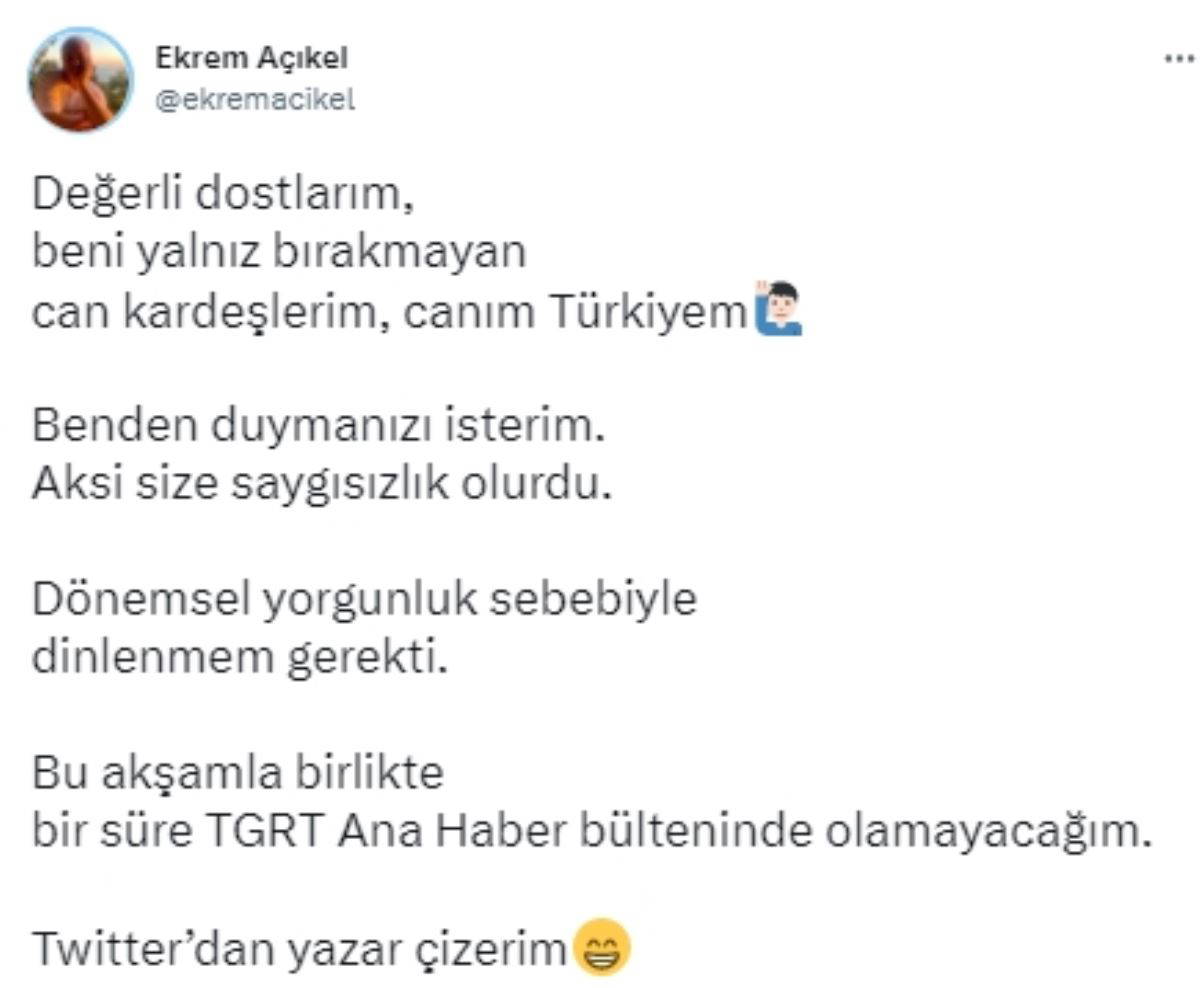 “Değerli dostlarım, beni yalnız bırakmayan can kardeşlerim, canım Türkiyem Benden duymanızı isterim. Aksi size saygısızlık olurdu. Dönemsel yorgunluk sebebiyle dinlenmem gerekti. Bu akşamla birlikte bir süre TGRT Ana Haber bülteninde olamayacağım. Twitter’dan yazar çizerim” ifadelerini kullandı.
