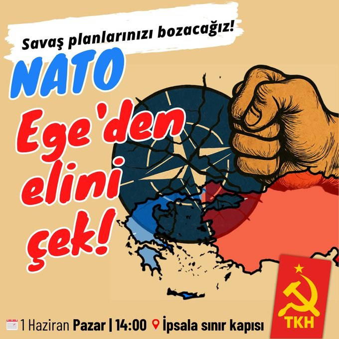 "Partimiz Türkiye Komünist Hareketi, ABD’nin Ege’de çatışmayı körükleyen adımlarına karşı emekçileri mücadeleye çağırmaktadır. Bu anlamda partimiz, Pazar günü İpsala Sınır Kapısı önünde NATO’nun planlarına karşı buluşacağını ilan eder.