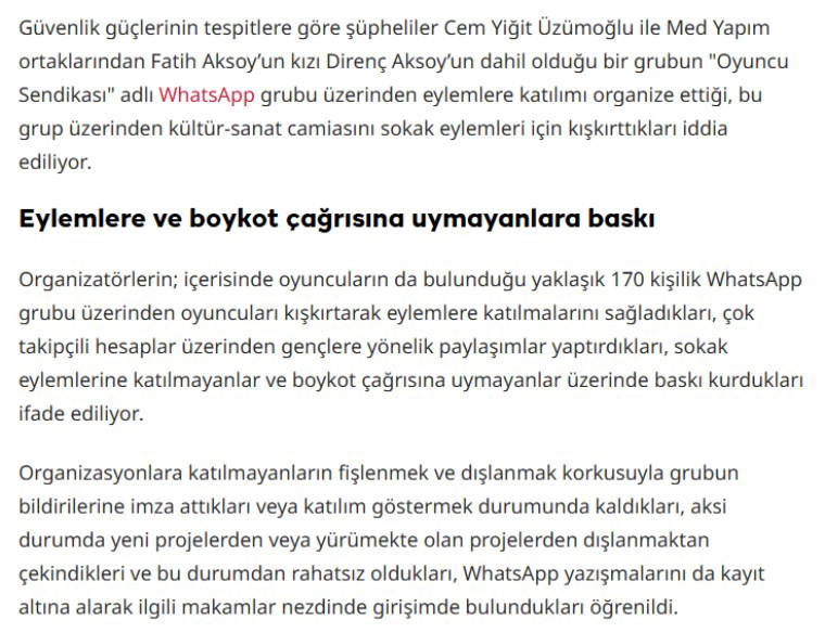 “Organizatörlerin; içerisinde oyuncuların da bulunduğu yaklaşık 170 kişilik WhatsApp grubu üzerinden oyuncuları kışkırtarak eylemlere katılmalarını sağladıkları, çok takipçili hesaplar üzerinden gençlere yönelik paylaşımlar yaptırdıkları, sokak eylemlerine katılmayanlar ve boykot çağrısına uymayanlar üzerinde baskı kurdukları ifade ediliyor.