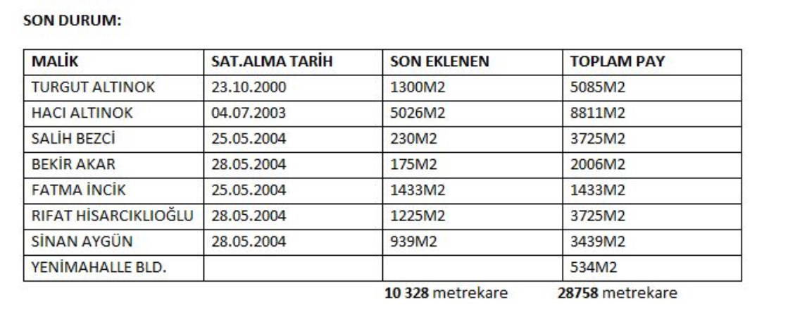 Bu parsellerdeki (451 ve 696 parseller) hissedarlardan satın alınan 10 bin 328 metrekare arsaların alıcıları ve aldıkları metrekareler ve ortakları şu şekilde oluşmuş.