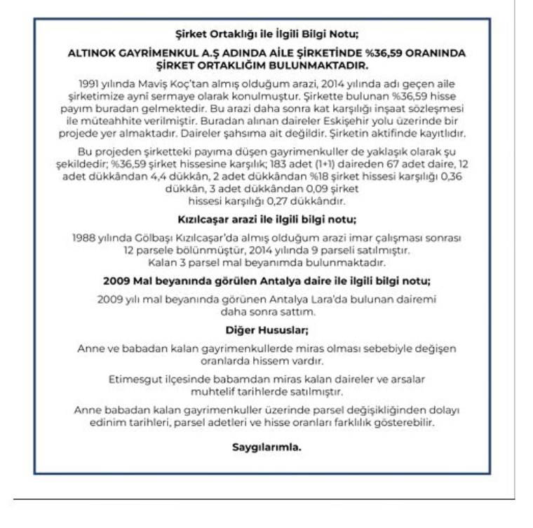 Ancak bu beyanlarına karşılık dairelerin, dükkanların değerlerini açıklamamıştı. Hatta Banka mevduat bilgileri, ziynet eşyaları, araçlar, mevcut döviz, eşlerin mal durumu da duyurulmamıştı.