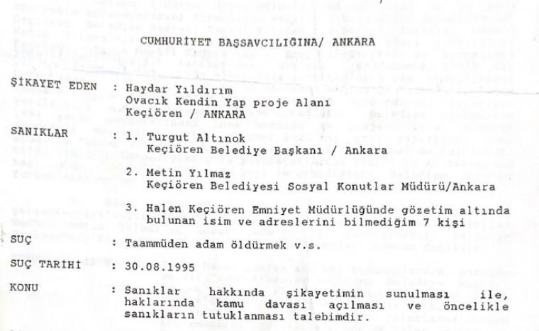 Oğlumu öldüren diğer oğlumla beni yaralayan ve şu anda emniyette bulunduklarını öğrendiğim sanıkları bu suçlara azmettirenler Keçiören Belediye Başkanı Turgut Altınok ile Sosyal Konutlar Müdürü Metin Yılmaz’dır. Gerek makamınıza gerek diğer idari yetkililere Keçiören Ovacık Mevki Kendin Yap 1. Etap hak sahipleri ve derneğimiz yöneticileri değişik tarihlerdeki birçok başvurusunda; böyle bir olayın yaşanacağını, proje alanındaki yurttaşların can güvenlikleri bulunmadığını, belediye başkanının encümene aldırdığı kararların idare mahkemelerince iptal edildiğini, yürütmenin durdurulması kararları verildiğini ancak idarenin buna uymadığını, belediye başkanının 1994 yerel seçimlerinden önce verdiği ve projeyi iptal edeceği yönündeki sözlerini yerine getirmek için her şeyini yaptığını, kamu oyunun A Takımı olarak bildiği silahlı güçleri bu alanda da kullandığını bildirmişti. Öğrendiğime göre yakalananlardan birisi bu A Takımının başı olan ‘Çeyrek Apo’dur. Bu kişi ve arkadaşları Belediye Başkanı Turgut Altınok’un tetikçisidir.