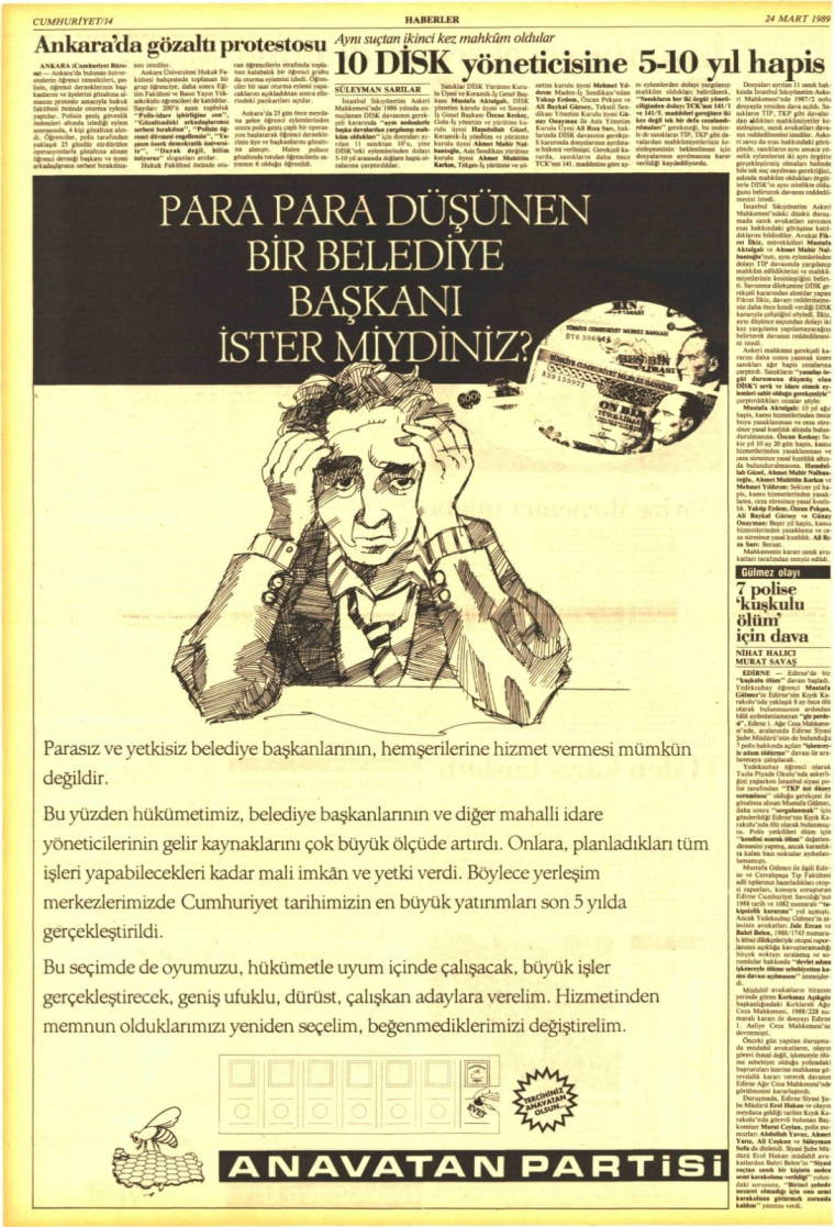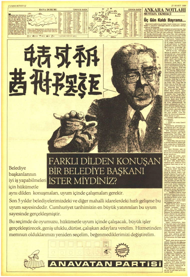 ANAP’ın tek başına iktidar olduğu 1989 yılında yerel seçimlere gidildiğinde gazetelere birbirinin devamı olan tam sayfa ilanlar vererek seçmenleri “Bizim adayımızı seçmezseniz şehrinize hizmet gelmez” mesajı veriliyordu. Bu ilanlarda“ Farklı dilden konuşan belediye başkanı ister miydiniz?”, “Para para düşünen bir belediye başkanı ister miydiniz?”, “Kamakmız, mekânsız, imkânsız ve iktidarsız bir belediye başkanı ister miydiniz?”, “Eli kolu bağlı bir belediye başkanı ister miydiniz?” sorularının başlıkta yer aldığı ilanların alt paragraflarında şöyle deniyordu: