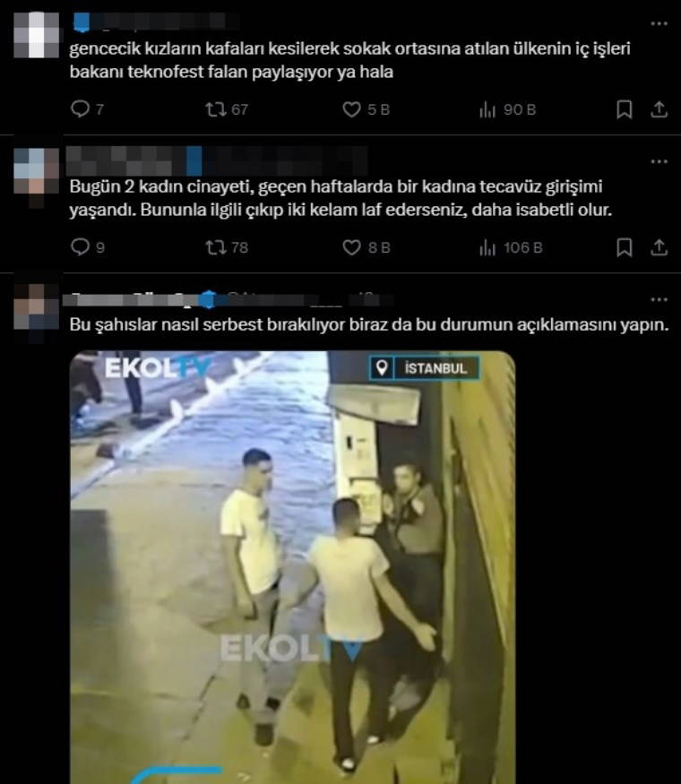 Bakan Yerlikaya'nın bu gönderisinin altına da "Kafayı çekip kadın taciz edenleri, öldürenleri de tekrar bırakmamak üzere almanızı bekleriz", "Sayın Bakan güzel ülkemizde dün 2 tane yavrumuzun kafasını kestiler. Niye açıklama yapma gereği duymuyorsunuz?" şeklinde yorumlar yapıldı.