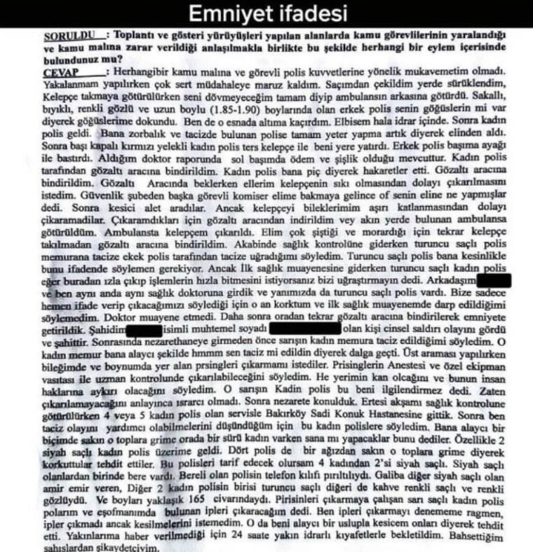 Elbisem hala idrar içinde. Sonra kadın polis geldi. Bana zorbalık ve tacizde bulunan polise 'Tamam yeter yapma artık' diyerek elinden aldı. Sonra başı kapalı kırmızı yelekli kadın polis ters kelepçe ile beni yere yatırdı. Erkek polis başıma ayağı ile bastırdı. Aldığım doktor raporunda sol başımda ödem ve şişlik olduğu mevcuttur. Kadın polis tarafından gözaltı aracına bindirildim...