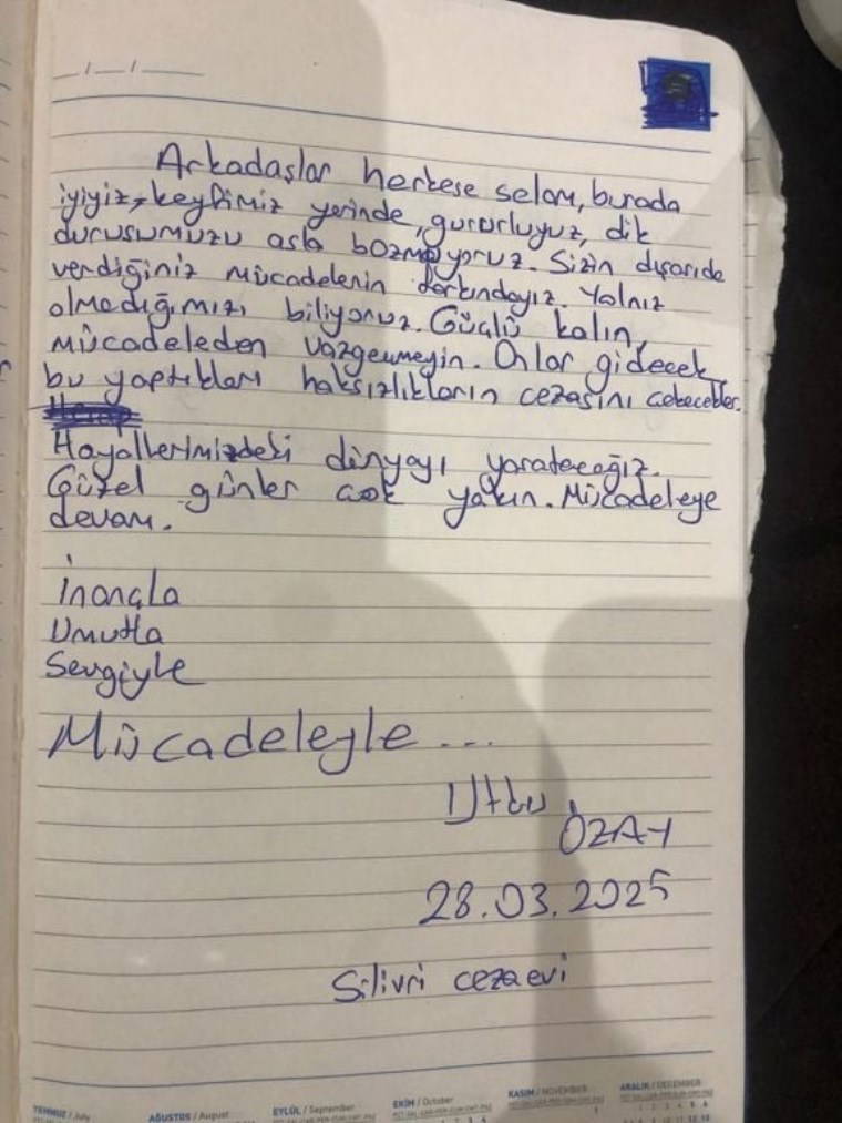 "Arkadaşlar herkese selam. Burada iyiyiz, gururluyuz. Dik duruşumuzu asla bozmuyoruz. Sizin dışarıda verdiğiniz mücadelenin farkındayız. Yalnız olmadığımızı biliyoruz. Güçlü kalın, mücadeleden vazgeçmeyin. Onlar gidecek, bu yaptıklarının cezasını çekecekler. Hayallerimizdeki dünyayı yaratacağız. Güzel günler çok yakın, mücadeleye devam."