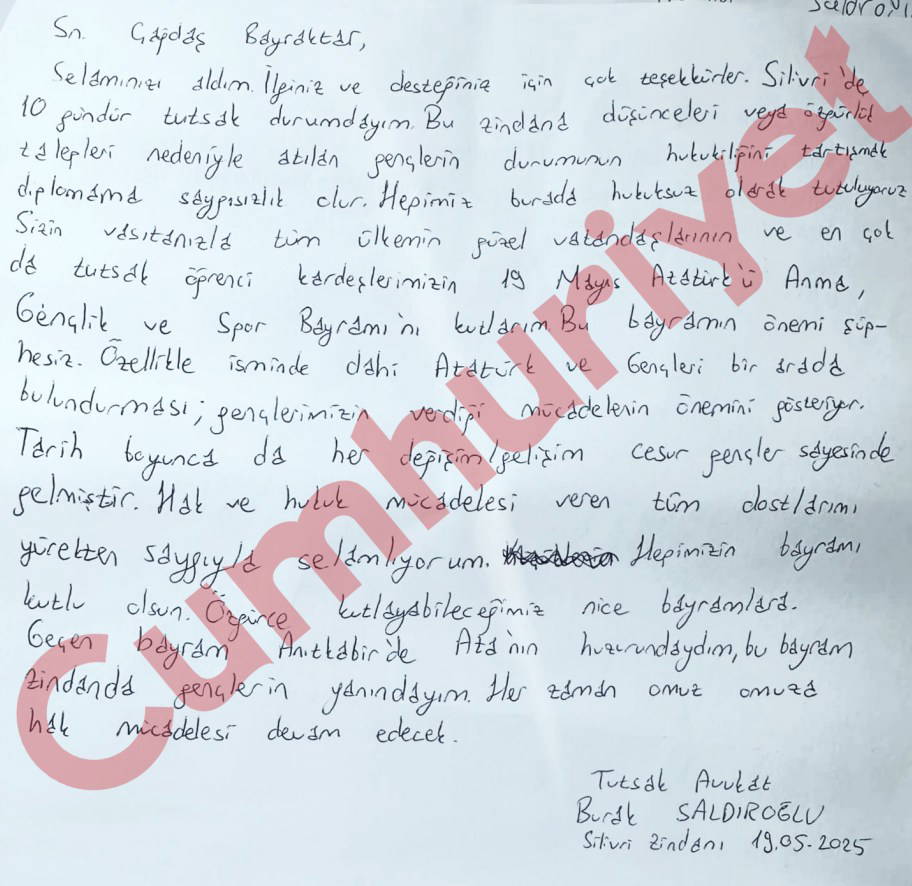 CHP'nin Cumhurbaşkanı adayı, İBB Başkanı Ekrem İmamoğlu'nun X hesabının engellenmesinin ardından, İmamoğlu'nun paylaşımlarını kağıda bastırarak sokaklarda dağıtan ve bu görüntüleri sosyal medya hesabından paylaşması sonrası tutuklanan CHP Beykoz Gençlik Kolları Başkanı ve avukat Burak Saldıroğlu, Cumhuriyet’e “19 Mayıs Atatürk’ü Anma, Gençlik ve Spor Bayramı” mesajı yolladı.