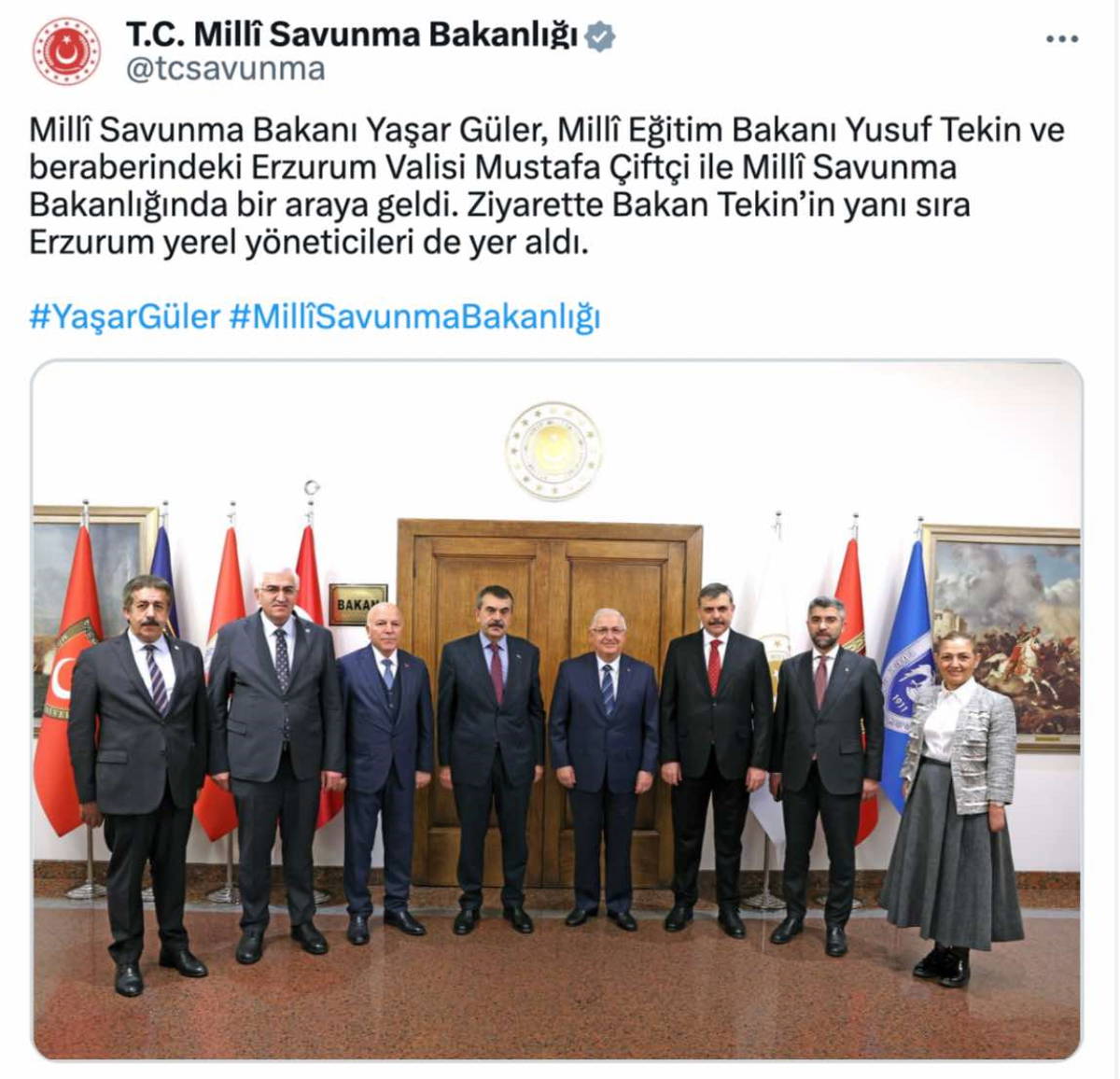 “Millî Savunma Bakanı Yaşar Güler, Millî Eğitim Bakanı Yusuf Tekin ve beraberindeki Erzurum Valisi Mustafa Çiftçi ile Millî Savunma Bakanlığında bir araya geldi. Ziyarette Bakan Tekin’in yanı sıra Erzurum yerel yöneticileri de yer aldı.”