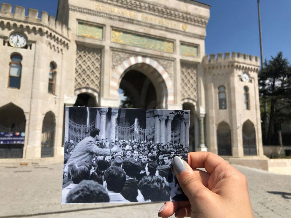 (Emek Gençliği, Deniz Gezmiş ve mücadele arkadaşlarının İstanbul Üniversitesi’ndeki fotoğraflarını bugüne uyarladı. Söz konusu fotoğraflarda Gezmiş ve arkadaşlarının bulunduğu mekânlar yer alıyor.)