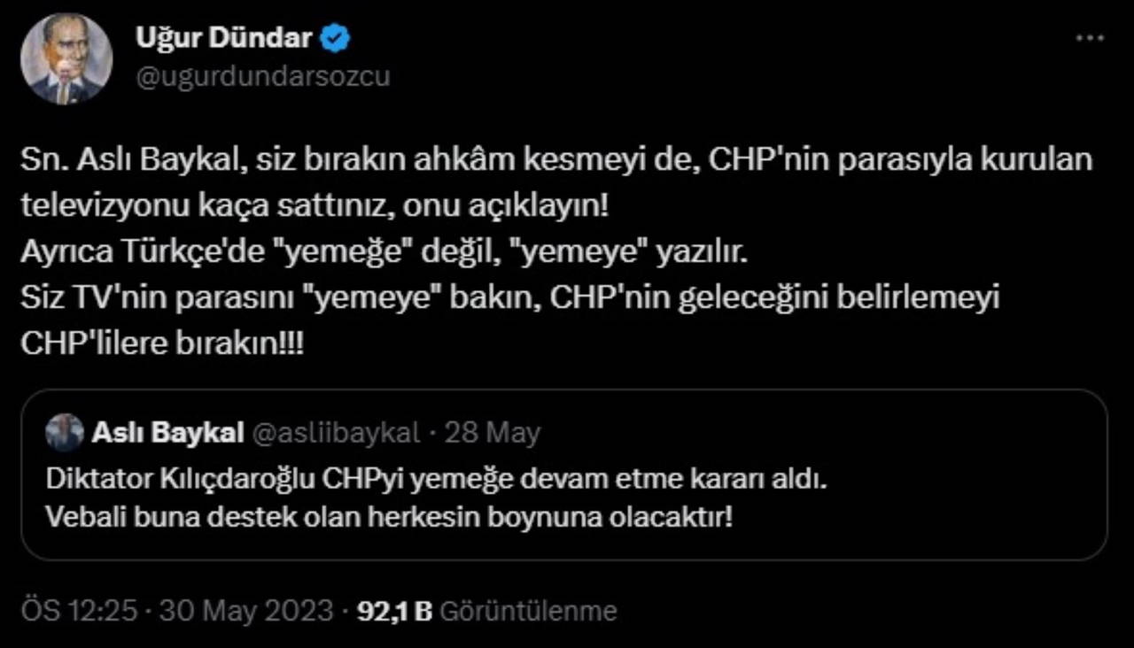 "Sn. Aslı Baykal, siz bırakın ahkâm kesmeyi de, CHP'nin parasıyla kurulan televizyonu kaça sattınız, onu açıklayın! Ayrıca Türkçe'de 'yemeğe' değil, 'yemeye' yazılır. Siz TV'nin parasını 'yemeye' bakın, CHP'nin geleceğini belirlemeyi CHP'lilere bırakın!!!"