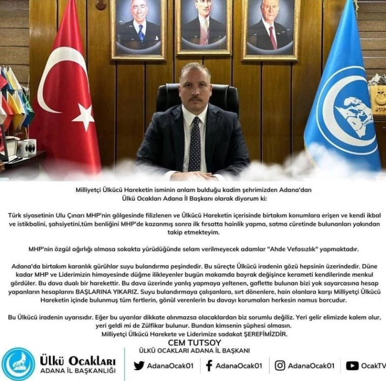 Ülkü Ocakları Adana İl Başkanı Cem Tutsoy, önceki akşam sosyal medya hesabından dikkat çeken bir açıklama yaptı.