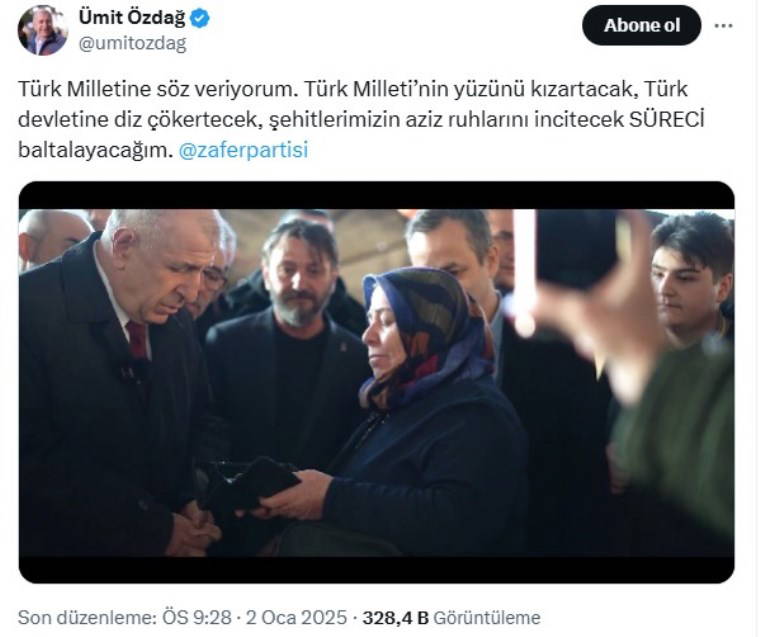 Özdağ, sosyal medya hesabından yaptığı videolu paylaşımında, "Türk Milletine söz veriyorum. Türk Milleti’nin yüzünü kızartacak, Türk devletine diz çökertecek, şehitlerimizin aziz ruhlarını incitecek süreci baltalayacağım" ifadelerine yer verdi.