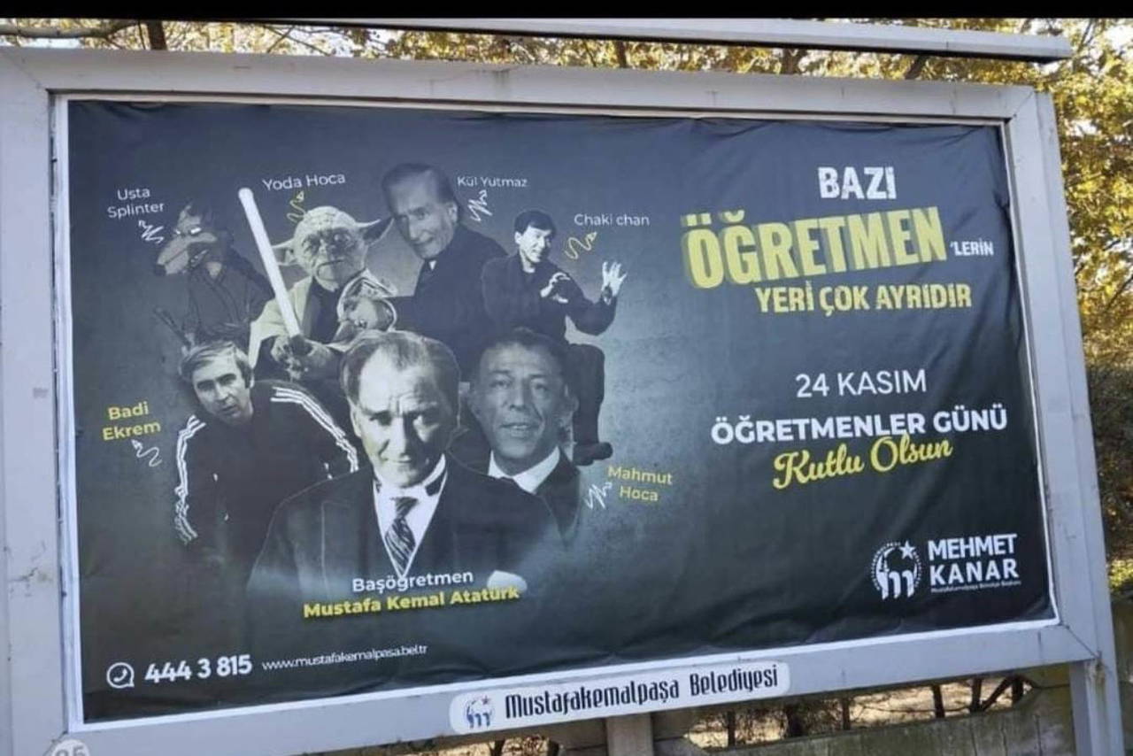 Ulu Önder Mustafa Kemal Atatürk ile birlikte Hababam Sınıfı karakterlerinden Kül yutmaz, Badi Ekrem, Mahmut Hoca, Yıldız Savaşları (Star Wars) karakterlerinden Yoda Hoca ve Ninja Kaplumbağalar çizgi filmindeki Splinter Usta karakteri yer aldığı afişte “Bazı öğretmenlerin yeri çok ayrıdır. 24 Kasım Öğretmenler Günü kutlu olsun” ifadeleri yer aldı.
