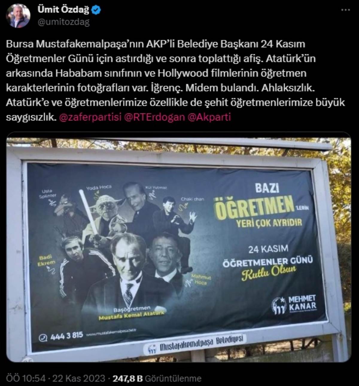 "Bursa Mustafakemalpaşa’nın AKP’li Belediye Başkanı 24 Kasım Öğretmenler Günü için astırdığı ve sonra toplattığı afiş. Atatürk’ün arkasında Hababam sınıfının ve Hollywood filmlerinin öğretmen karakterlerinin fotoğrafları var. İğrenç. Midem bulandı. Ahlaksızlık. Atatürk’e ve öğretmenlerimize özellikle de şehit öğretmenlerimize büyük saygısızlık."