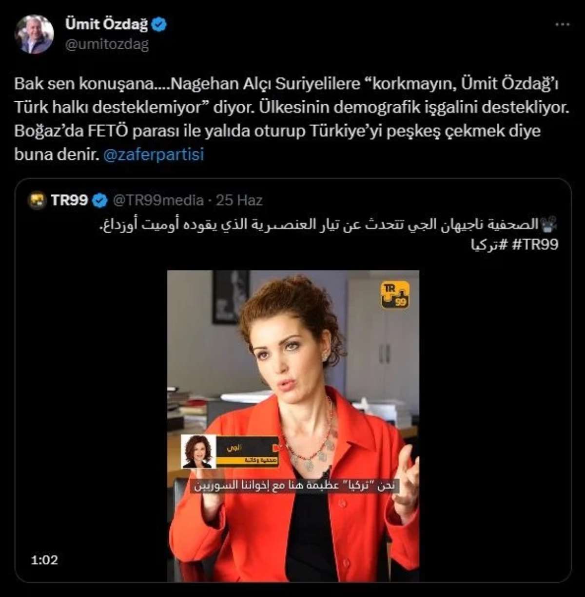 Twitter'dan Alçı'nın söz konusu röportajını alıntılayan Özdağ, "Bak sen konuşana….Nagehan Alçı Suriyelilere 'Korkmayın, Ümit Özdağ’ı Türk halkı desteklemiyor' diyor. Ülkesinin demografik işgalini destekliyor. Boğaz’da FETÖ parası ile yalıda oturup Türkiye’yi peşkeş çekmek diye buna denir" diye yazdı.