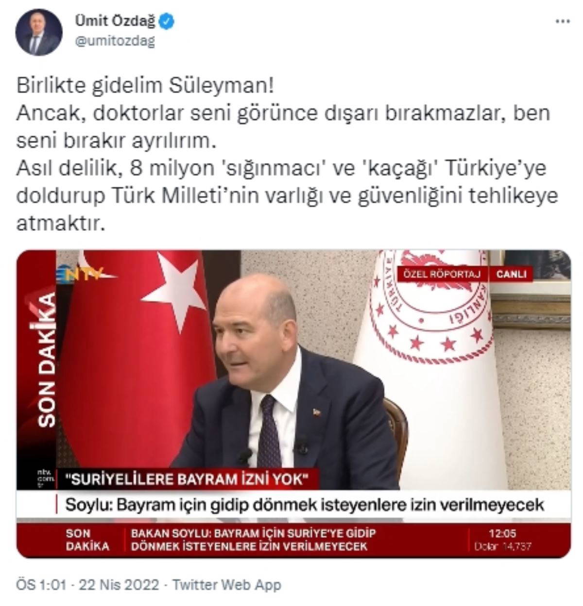 Soylu'nun konuşmasından ilgili bölümü paylaşan Özdağ, "Birlikte gidelim Süleyman! Ancak, doktorlar seni görünce dışarı bırakmazlar, ben seni bırakır ayrılırım. Asıl delilik, 8 milyon 'sığınmacı' ve 'kaçağı' Türkiye’ye doldurup Türk Milleti’nin varlığı ve güvenliğini tehlikeye atmaktır" ifadelerini kullandı.