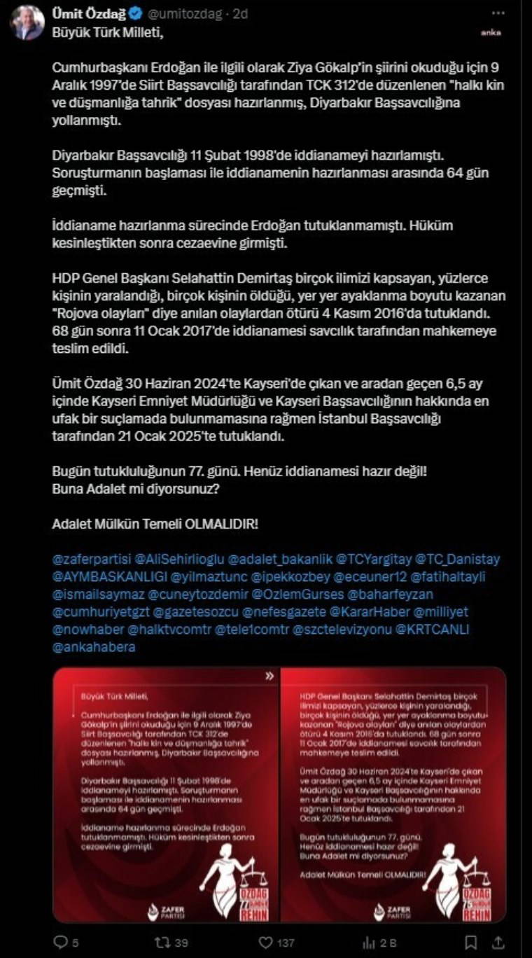 Ümit Özdağ 30 Haziran 2024'te Kayseri'de çıkan ve aradan geçen 6,5 ay içinde Kayseri Emniyet Müdürlüğü ve Kayseri Başsavcılığının hakkında en ufak bir suçlamada bulunmamasına rağmen İstanbul Başsavcılığı tarafından 21 Ocak 2025'te tutuklandı. Bugün tutukluluğunun 77. günü. Henüz iddianamesi hazır değil! Buna adalet mi diyorsunuz? Adalet mülkün temeli olmalıdır!"
