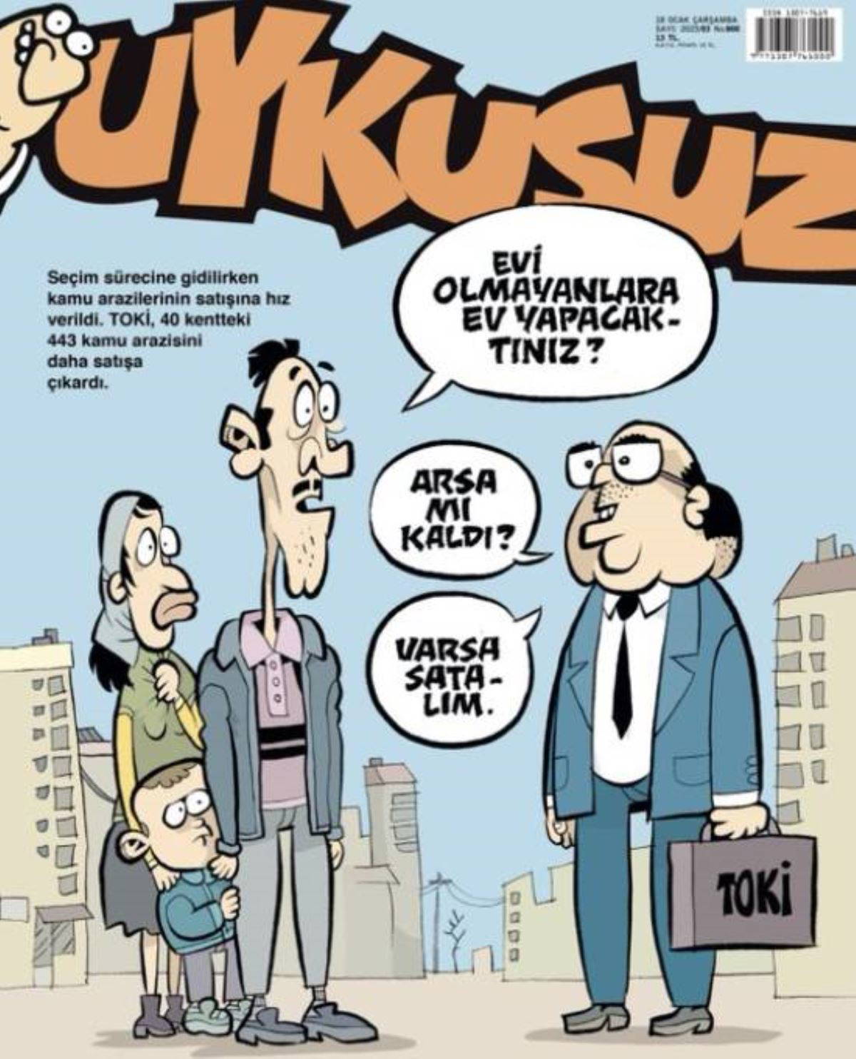 Söz konusu haberi bu haftaki sayısının kapağına taşıyan Uykusuz dergisi, karikatüre "Seçim sürecine gidilirken kamu arazilerinin satışına hız verildi. TOKİ, 40 kentteki 443 kamu arazisini daha satışa çıkardı." notunu düştü.