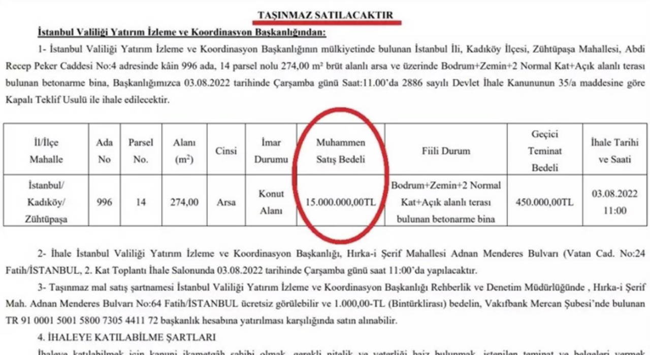 İstanbul Valiliği Resmi Gazete’ye üçüncü kez ilan vererek, Kadıköy’de Fenerbahçe Stadının yanında bulunan, 996 ada 14 parseli yeniden satışa çıkardı. 274 metrekarelik parselde, bodrum ve terası da olan 3 katlı yapı bulunuyor. Fenerbahçe Gönüllüleri Derneği’nin de uzun zamandır faaliyet gösterdiği bina ilk kez, 3 Ağustos 2022 tarihinde 15 milyon muhammen bedel üzerinden satışa çıkarılmıştı.