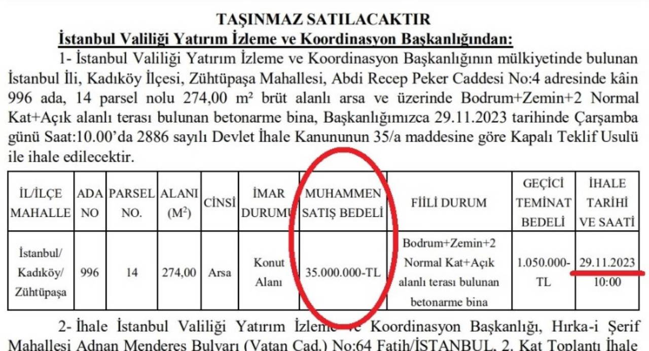 İçişleri Bakanı Ali Yerlikaya’nın, İstanbul Valiliği sırasında yayınlanan ilk ihalede söz konusu parselin satışı gerçekleşmemişti. Davut Gül’ün İstanbul Valisi olarak atanmasından 2 ay sonra, 18 Ağustos 2023 tarihinde söz konusu yerle ilgili olarak ikinci kez satış ilanı yayımlandı. İkinci ihalede muhammen satış bedeli, 15 milyon TL’den 40 milyon TL’ye çıkarıldı.