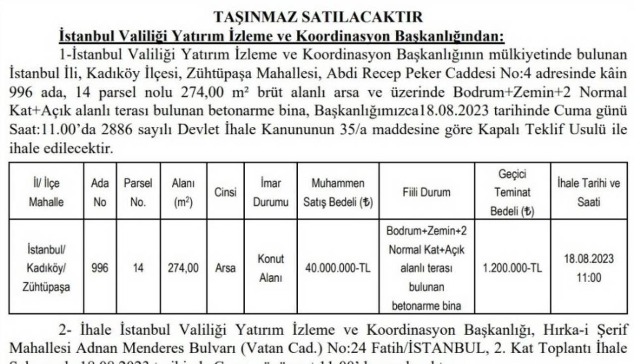 İstanbul Valiliğinin bir birimi olan Yatırım İzleme ve Koordinasyon Başkanlığı’nın başkanlığını da, İstanbul Valisi Davut Gül yapıyor. 288 sayılı Devlet İhale Kanunun 35/a maddesine göre kapalı teklif usulüne göre ihale edilecek olan parsel, Fenerbahçe Stadı’nın yaklaşık 60 metre güney batısında bulunuyor. Gerekçesini kararda belirtmek suretiyle İhale Komisyonu’nun ihaleyi yapıp yapmamakta serbest olduğu vurgulanan ilanda, Komisyonun ihaleyi yapmamak kararına itiraz edileceği de belirtildi.