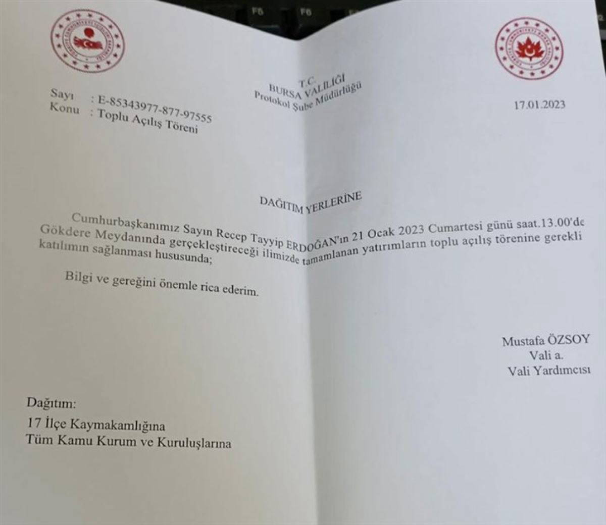 - Yani bu siyasetin yüz karası olan bir şey, bunu kim savunuyorsa oturalım beraber tartışalım. Halk vicdanında nasıl bunu savunacaklar bilemiyorum. Yani bakın aşağıda tüm kamu kurum ve kuruluşlarına diyor, açılış törenine gerekli katılım sağlanması, yani emirdir normalde, üstünde Bursa Valiliği yazıyor. Yani Tapu Kadastrodaki memura bunu gönderiyorsunuz, mitinge gel diyorsunuz, yani bunun izah edilebilir bir yanı yok ki. Çok kısa bir süre kaldı. İktidara geldiğimiz zaman asla buna müsaade etmeyiz.”