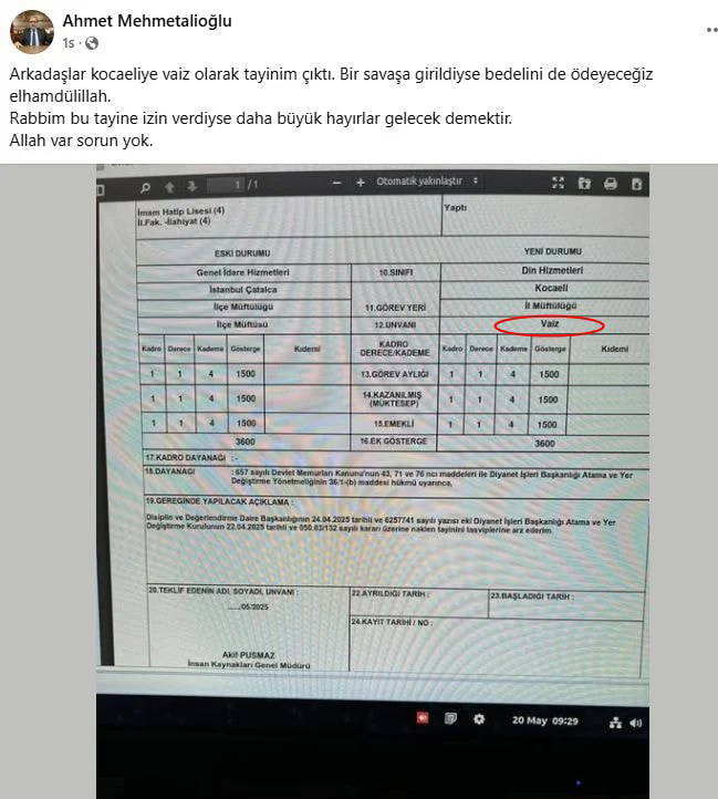 “Arkadaşlar Kocaeli'ye vaiz olarak tayinim çıktı. Bir savaşa girildiyse bedelini de ödeyeceğiz elhamdülillah. Rabbim bu tayine izin verdiyse daha büyük hayırlar gelecek demektir. Allah var sorun yok.”