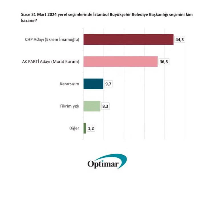 Optimar Araştırma Başkanı Hilmi Daşdemir'in kişisel YouTube hesabından yaptığı yayında anket sonuçlarına göre, İstanbul Büyükşehir Belediye Başkanı Ekrem İmamoğlu'nun, AKP'nin İstanbul adayı Murat Kurum'un önünde yer aldığı görüldü.