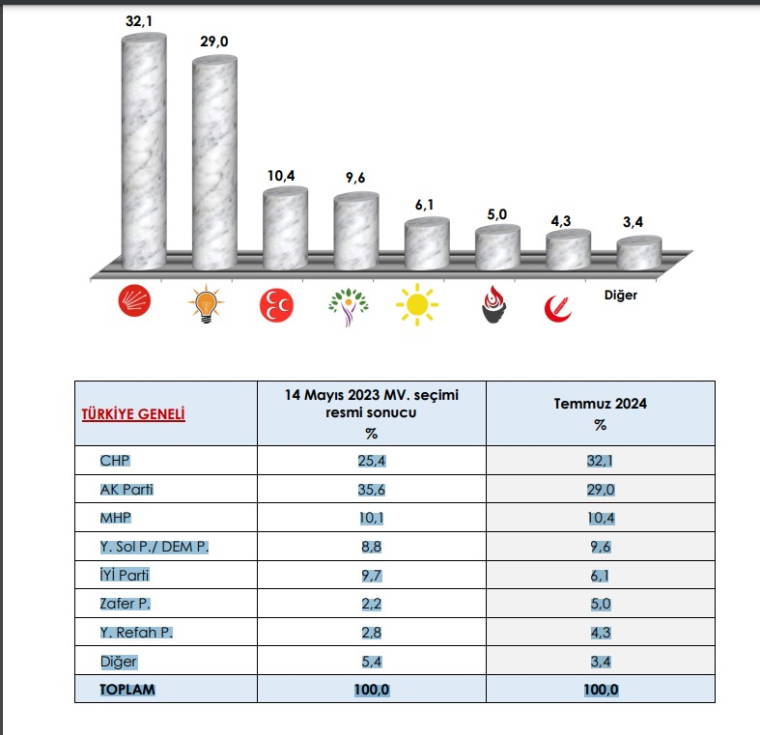 AREA Araştırma tarafından 4-7 Temmuz 2024 tarihleri arasında 18 yaş ve üzeri 2 bin 56 kişiyle Türkiye Siyasi Durum Araştırması yapıldı. Halka “Bugün milletvekili seçimi olsa hangi partiye oy verirsiniz” sorusu yöneltildi. Elde edilen veriler siyasi partilerin 14 Mayıs genel seçimlerinde kazandıkları oy oranlarıyla karşılaştırıldı. Buna göre geçerli oylar üzerinden ilk sırayı yüzde 32,1 ile CHP aldı. Genel seçimde yüzde 25,4 oy oranıyla ikinci sırada yer alan CHP’nin yükselişi dikkat çekti. AKP’nin ise ilk kez yüzde 30’un altına düştüğü görüldü. Ankete katılanların yüzde 29’u AKP cevabını verdi. AKP, geçtiğimiz seçimde yüzde 35,6 oy oranına sahipti. MHP ise genel seçimlere göre oy oranını 0,3 yükselterek 10,4’lük oy oranına erişti. Geçtiğimiz seçimlere kıyasla oy oranını yükselten bir diğer parti ise DEM Parti oldu. Seçime Yeşil Sol Parti adıyla giren DEM Parti, yüzde 8,8 oy almıştı. Ankette ise partinin 9,6’lara ulaştığı görüdü. İYİ Parti’nin oy oranı ise 3,6 puan düşerek 6,1 oldu. Zafer Partisi’nin de oy oranının iki katından fazlasını kazanarak 5’e yükseldiği görüldü. Yeniden Refah Partisi’nin (YRP) ise oy oranı 4,3’e çıkarak 1,5 puan yükseldi.