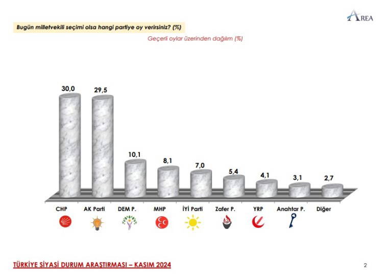 Area Araştırma’nın “Kasım ayı Türkiye Siyasi Gündem Araştırması” anketinin sonucu, yurttaşların güncel siyasi tartışmalara verdiği tepkileri ortaya koydu. Ankette “Bu pazar seçim olsa hangi partiye oy verirsiniz” sorusunu yanıtlayan katılımcılar, birinci sıraya yüzde 22.2 oyla CHP’yi yerleştirdi.