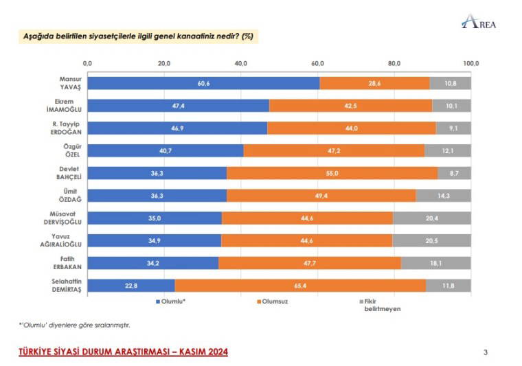 Yavaş’ın ardından gelen İstanbul Büyükşehir Belediye Başkanı Ekrem İmamoğlu da yüzde 47.4 olumlu oy aldı. Cumhurbaşkanı Erdoğan’ın Yavaş ve İmamoğlu’nun ardında 3. sırada yer alması dikkat çekti. Erdoğan, katılımcıların yüzde 46.9’undan olumlu oy alabildi.