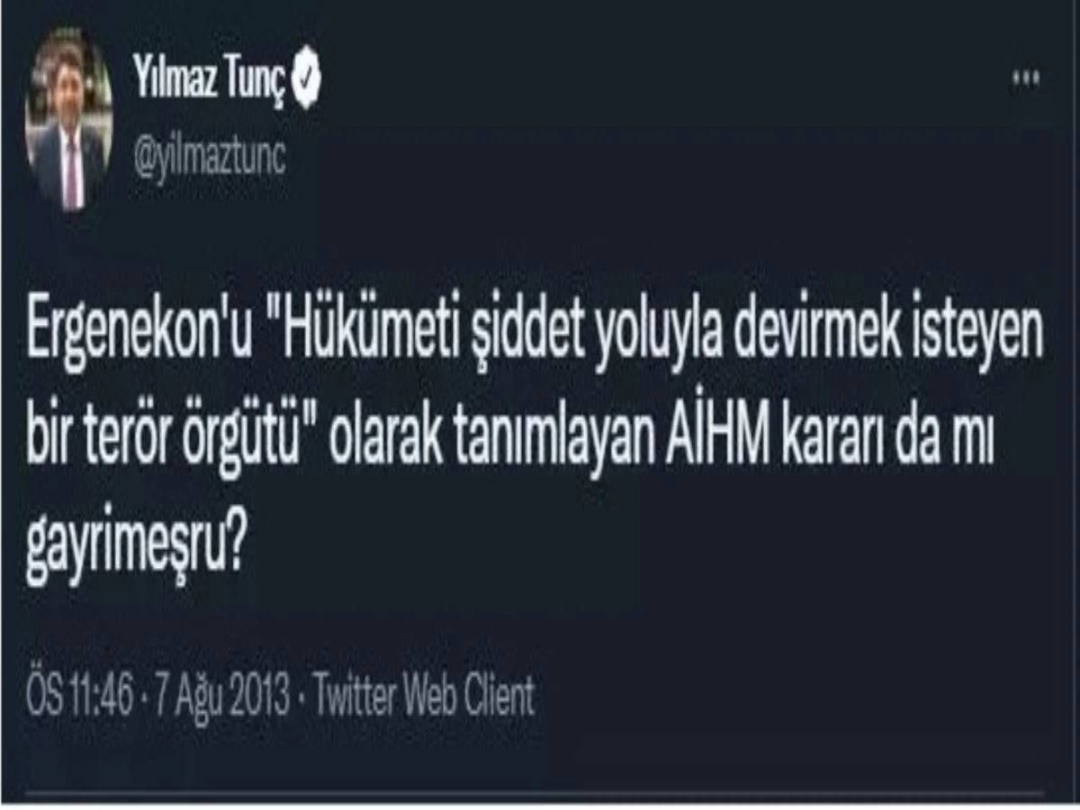 Tunç ayrıca, 2013 yılında Avrupa İnsan Hakları Mahkemesi’nin 'Ergenekon örgütü' ile ilgili açıklamasını duyurarak sosyal medya hesabından, "Ergenekon’u ‘Hükümeti şiddet yoluyla devirmek isteyen bir terör örgütü’ olarak tanımlayan AİHM kararı da mı gayrimeşru?" ifadelerini kullanmıştı.