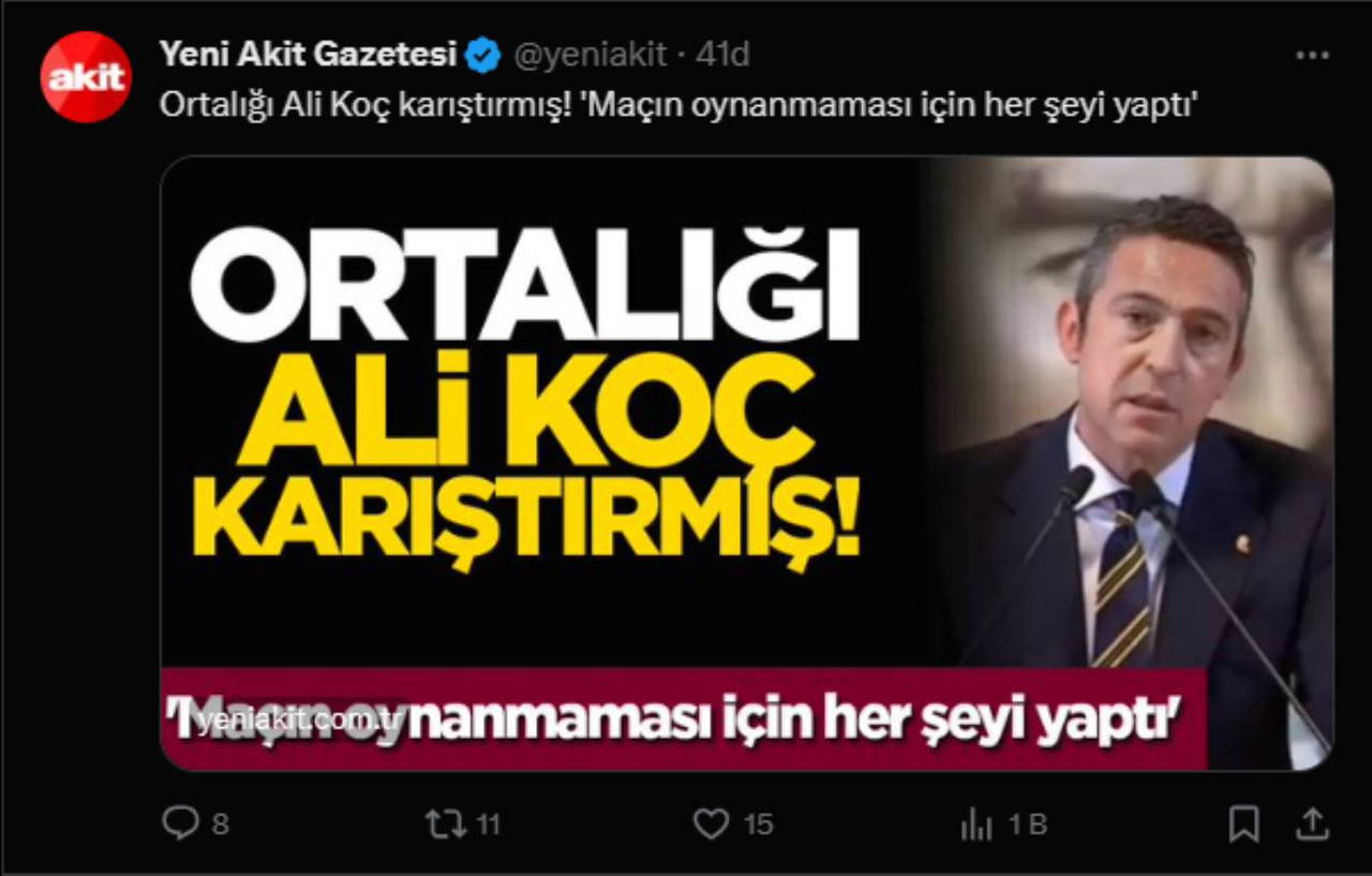 İktidara yakınlığıyla bilinen Yeni Akit gazetesi Ali Koç'u
