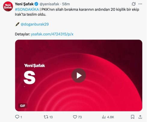 AKP'ye yakın Albayrak Medya Grubu bünyesindeki Yeni Şafak gazetesi, "Terörsüz Türkiye" diye adlandırılan süreç kapsamında Irak'ta terör örgütü PKK üyesi 20 kişilik bir grubun teslim olduğunu öne sürdüğü bir haber yayımladı.