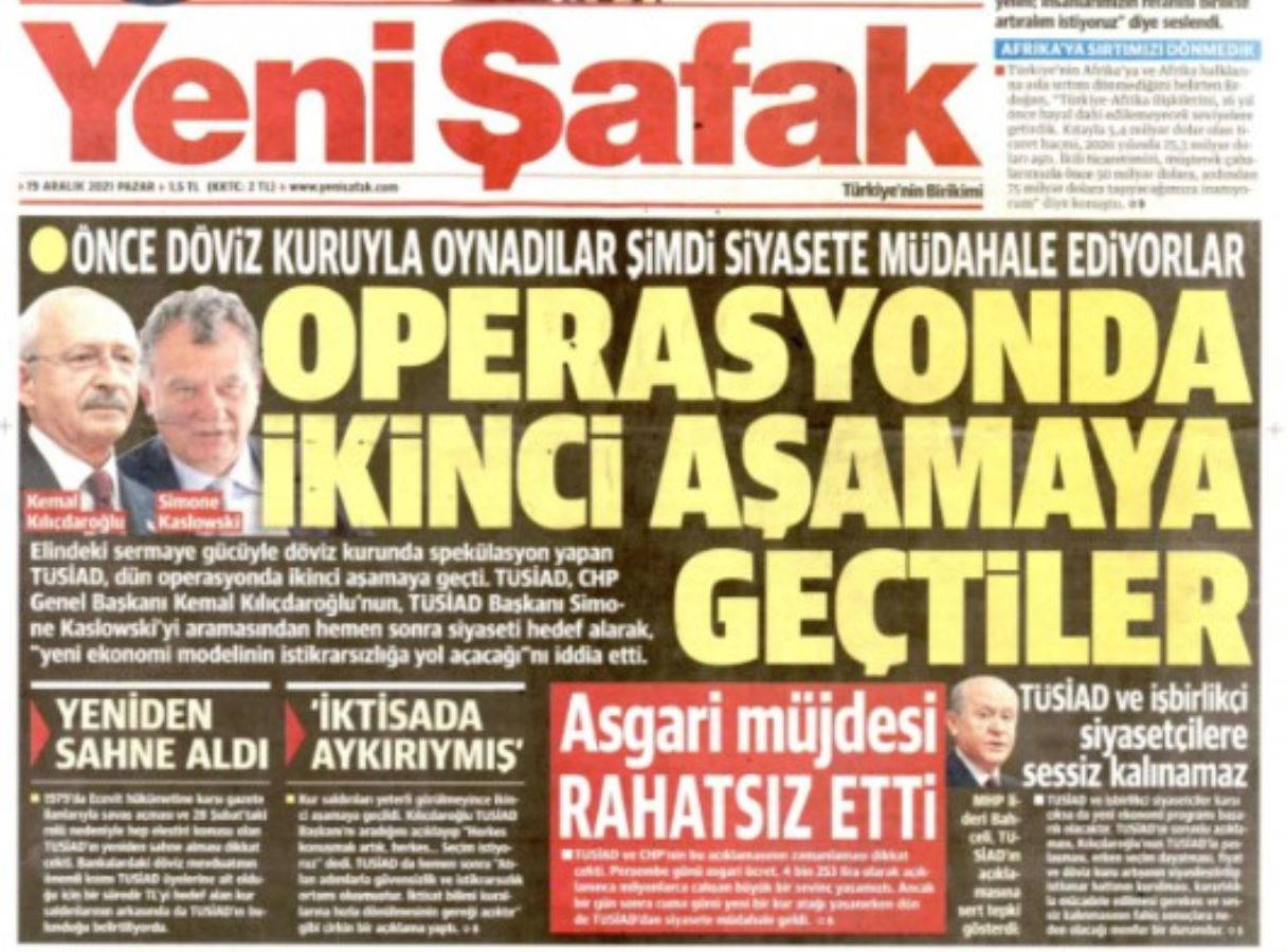İktidara yakınlığıyla bilinen Yeni Şafak gazetesi, AKP'nin ekonomi politikasını eleştiren Türk Sanayicileri ve İş İnsanları Derneği (TÜSİAD) ve CHP Genel Başkanı Kemal Kılıçdaroğlu'nu hedef aldı.