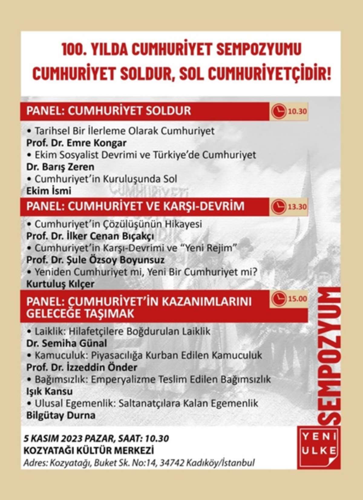 Dergi, 5 Kasım 2023 Pazar günü Kozyatağı Kültür Merkezinde “Cumhuriyet soldur, sol cumhuriyettir” başlığıyla sempozyum düzenleyecek.