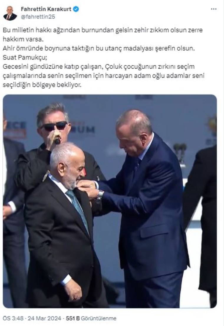"Bu milletin hakkı ağzından burnundan gelsin zehir zıkkım olsun zerre hakkım varsa. Ahir ömründe boynuna taktığın bu utanç madalyası şerefin olsun. Suat Pamukçu; Gecesini gündüzüne katıp çalışan, çoluk çocuğunun rızkını seçim çalışmalarında senin seçilmen için harcayan adam oğlu adamlar seni seçildiğin bölgeye bekliyor."