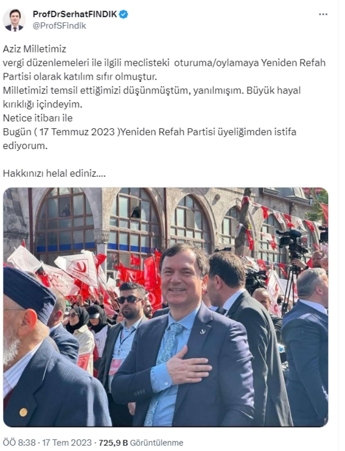 Bugün (17 Temmuz 2023) Yeniden Refah Partisi üyeliğimden istifa ediyorum.