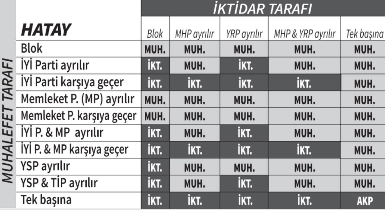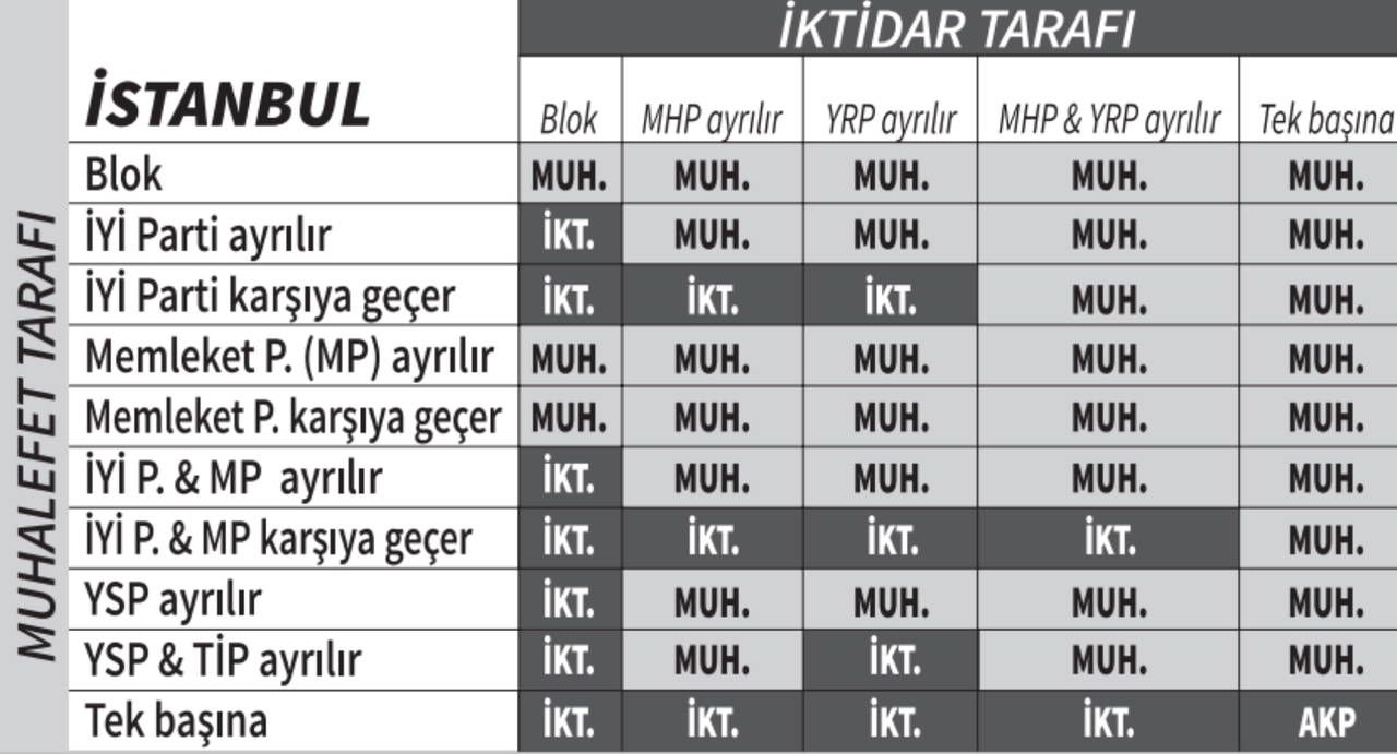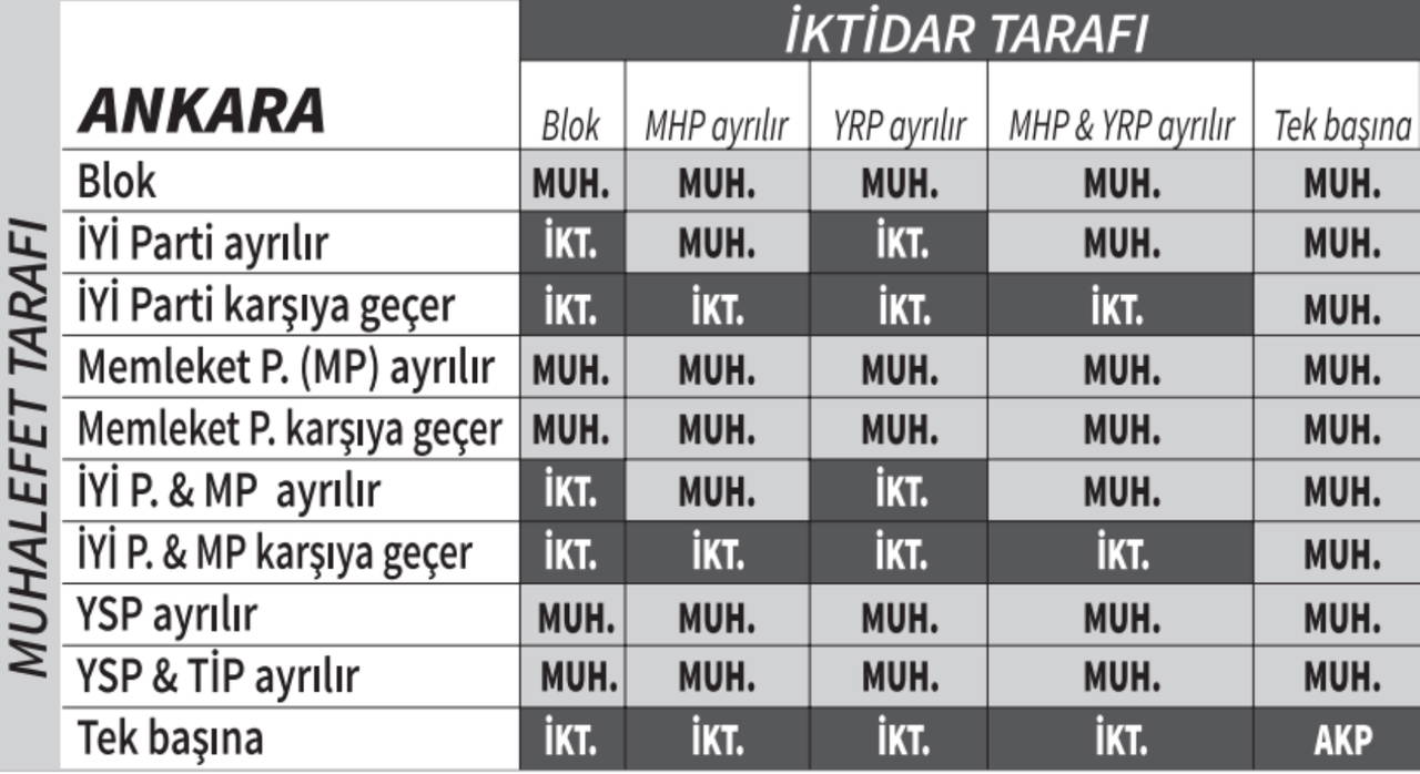 YSP ve TİP’in muhalefet blokundan ayrı olarak seçime girmesi durumunda muhalefeti Ankara, Antalya, Aydın, Balıkesir, Denizli, Diyarbakır, Eskişehir, İzmir, Mardin, Mersin, Muğla, Tekirdağ ve Van belediyelerini kazanırken İstanbul ve Adana’yı kaybediyor. Muhalefetin büyükşehirlerdeki etki alanı yüzde 39 oluyor.