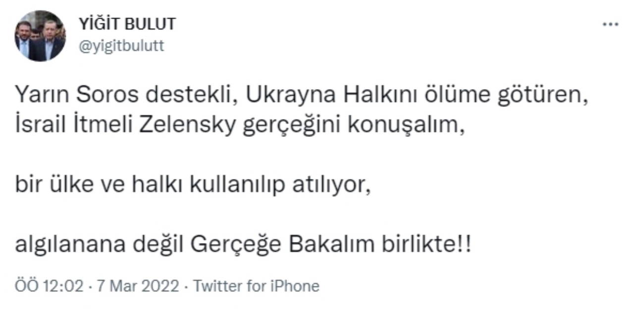 Ukrayna Devlet Başkanı Volodimir Zelenski’yi hedef alan Yiğit Bulut, Twitter hesabından yaptığı paylaşımda Zelenski için "Soros destekli", "İsrail itmeli" gibi ifadeler kullandı.