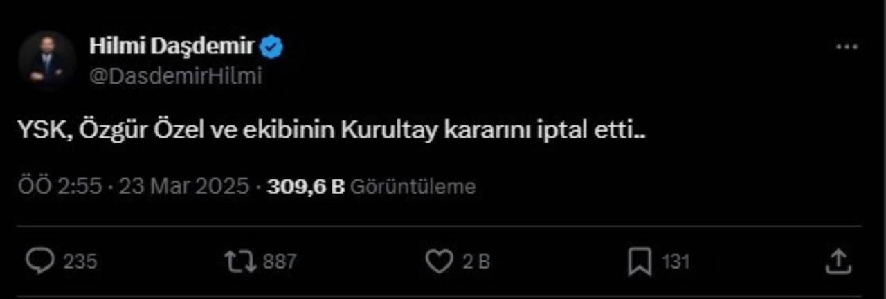 Daşdemir'i sosyal medya hesabından yaptığı 'YSK, Özgür Özel ve ekinin kurultay kararını iptal etti' paylaşımını sildi.