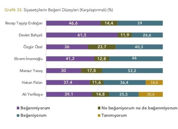 AKP’li Cumhurbaşkanı Recep Tayyip Erdoğan yüzde 39 oy oranıyla en beğenilen 4. siyasetçi oldu.