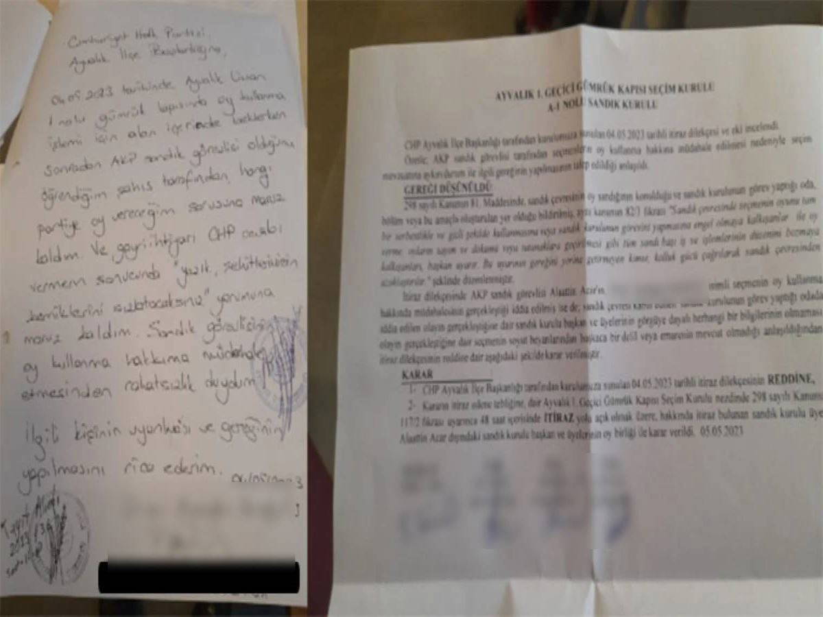 İlçe başkanlığı Balıkesir Ayvalık Geçici Gümrük Kapısı 1 Numaralı Sandık Kurulu Başkanlığı’na bir dilekçe verdi. Dilekçede, “Sandıkta AKP adına görevli sandık görevlisi tarafından P. A. K. isimli yurttaşın oy kullanma hakkında müdahale edildiğini tarafımıza aynı gün 11.30’da verdiği dilekçe ile bildirilmiştir. Seçim mevzuatına ve genelgelerine aykırı bu durumla ilgili gereğinin yapılmasını arz ederiz” ifadelerine yer verildi.