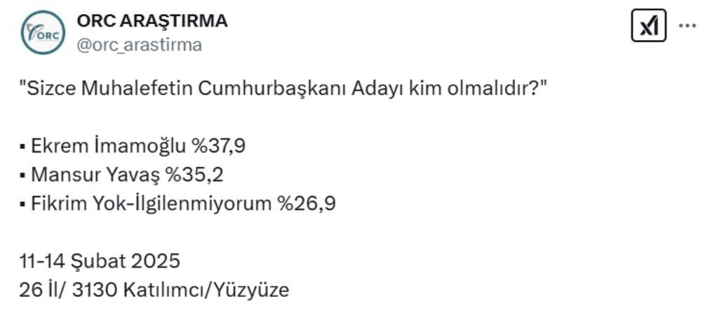 11-14 Şubat tarihlerinde, 3 bin 130 katılımcı ile 26 kentte yüz yüze yapılan araştırmada katılımcılara, "Sizce muhalefetin cumhurbaşkanı adayı kim olmalıdır?" diye soruldu.