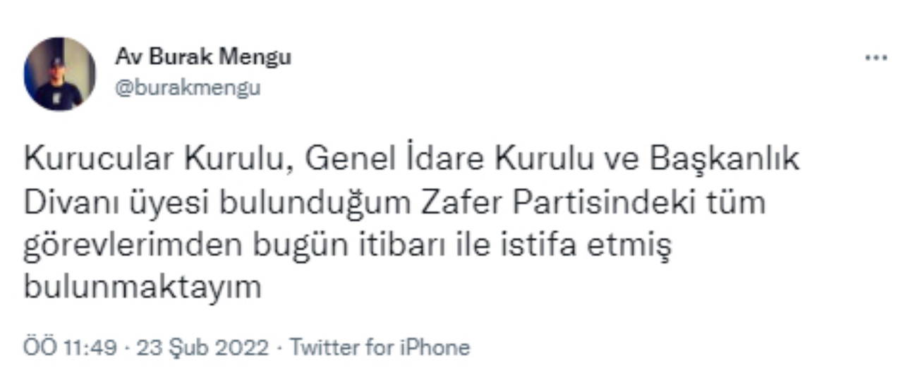 Mengü yaptığı açıklamada ''Kurucular Kurulu, Genel İdare Kurulu ve Başkanlık Divanı üyesi bulunduğum Zafer Partisindeki tüm görevlerimden bugün itibarı ile istifa etmiş bulunmaktayım'' ifadelerini kullandı.