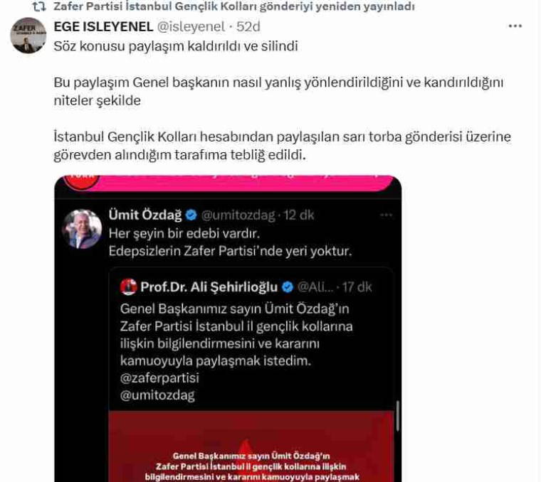 İşleyenel, Zafer Partisi lideri Özdağ'ın bir paylaşım yaptığını ve sonra bu paylaşımın silindiğini iddia etti. İşleyenel, "Söz konusu paylaşım kaldırıldı ve silindi. Bu paylaşım Genel başkanın nasıl yanlış yönlendirildiğini ve kandırıldığını niteler şekilde. İstanbul Gençlik Kolları hesabından paylaşılan sarı torba gönderisi üzerine görevden alındığım tarafıma tebliğ edildi" ifadelerini kullandı.